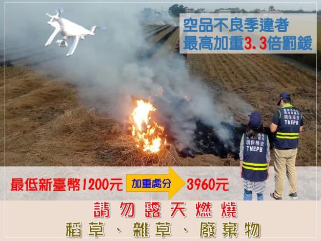 每年10月至翌年3月為空品不良季節,這段期間的露天燃燒更加重空氣品質不良影響,依空氣污染防制法規定可處新臺幣1,200元以上10萬元以下罰鍰,違反者若為工商廠場,可處10萬元以上500萬元以下罰鍰。一經查獲都會加重裁罰,罰則最低1200元經加重,最高會多出3.3倍變成3960元,違規受罰不划算。