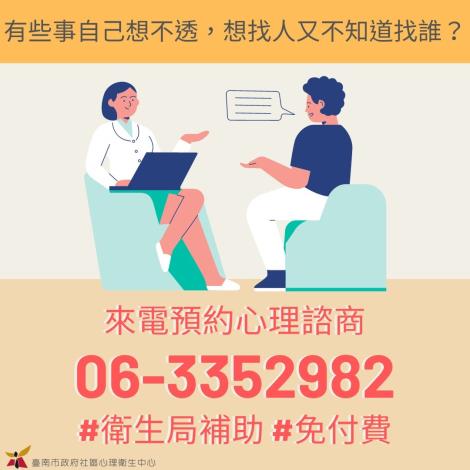 💓有些事自己想不透,想找人又不知道找誰?衛生局提供的免付費心理諮商是個不錯的選擇。💓諮商內容:家人或親密伴侶關係、親子教養、生活變故、人際關係、課業或工作壓力、經濟、 健康狀況、酗酒、藥癮、網路或遊戲成癮、環境適應、生涯規劃、照顧親屬、憂鬱症等可能造成情緒困擾之議題,與心理調適。💖諮商費用:衛生局補助,免收諮商費。(部分地點酌收場地費200元)★若不想進行面對面諮商,也可撥打衛生福利部24小時安心專線:1925(依舊愛我),有專人提供線上諮詢喔~