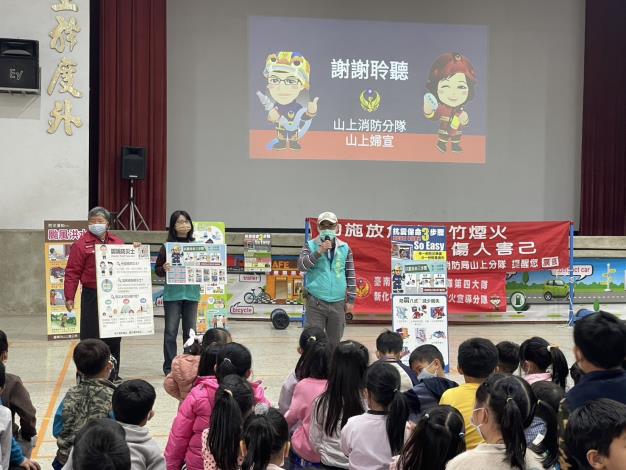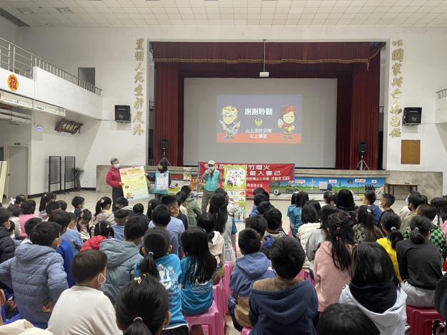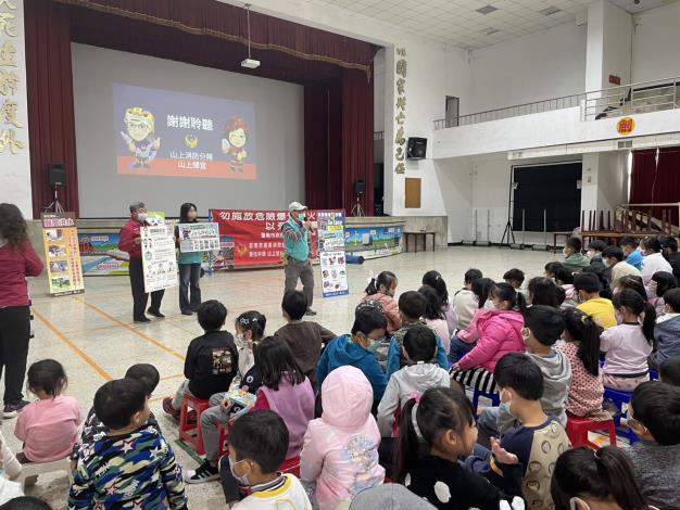 本所為推展校園防災工作,特與本區山上消防分隊、山上義消婦宣分隊,於114年1月16日上午至山上國小、德成幼兒園辦理防火預防、地震、風水災避難疏散等防災講習課程。透過講習課程讓師生了解各種災害的特性和應對方法,提高對防災意識的認知,幫助學校建立一個安全的學習環境,減少災害帶來的損失和影響。活動內容經由互動遊戲方式提昇學生的參與度,提高本次課程成效。經由本次防災講習活動,可以增強社區成員之間的合作意識,形成一個更加緊密的社區網絡。